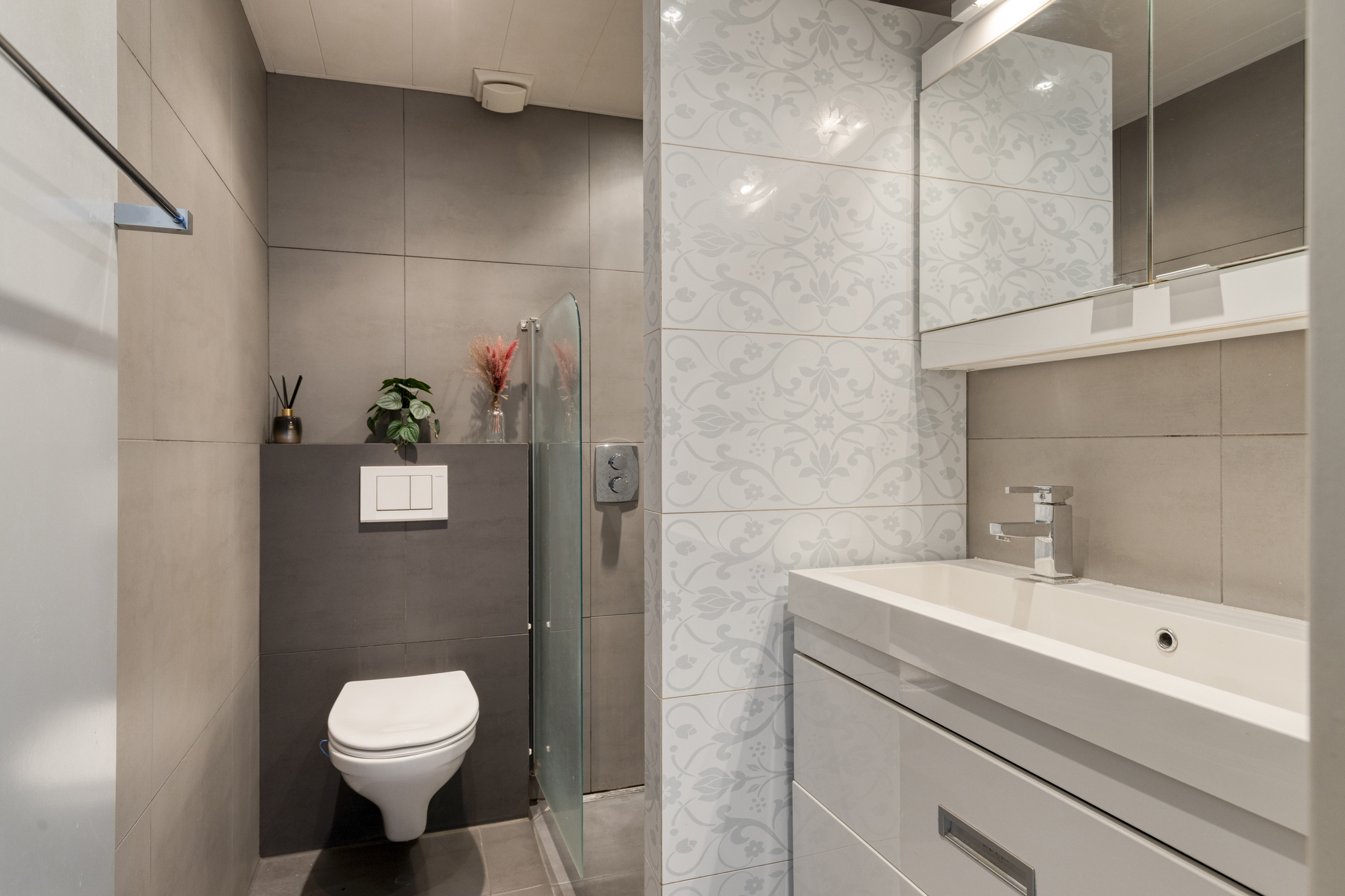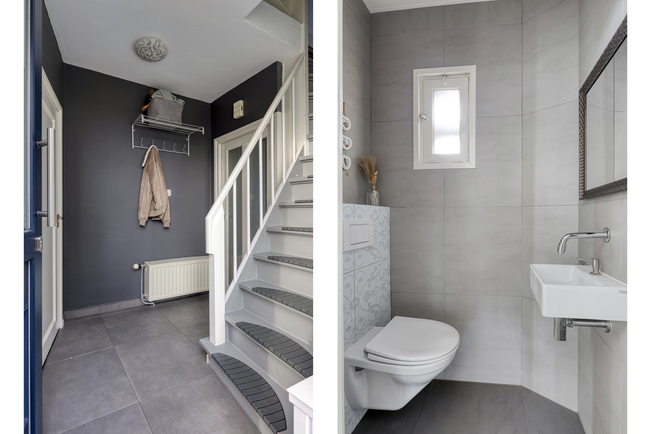 Natuurlijk kunt u de voordeur gebruiken, maar meestal komt u via de zijgevel binnen. Zodra u binnenstapt, valt direct de royale, lichte woonkamer op – een fijne leefruimte waar het hele gezin zich meteen thuis voelt. Vanuit de hal is er toegang tot de meterkast, het toilet, de woonkamer en de trap naar de eerste verdieping. Het toilet is volledig betegeld en voorzien van een wandcloset en fonteintje, strak en functioneel afgewerkt.