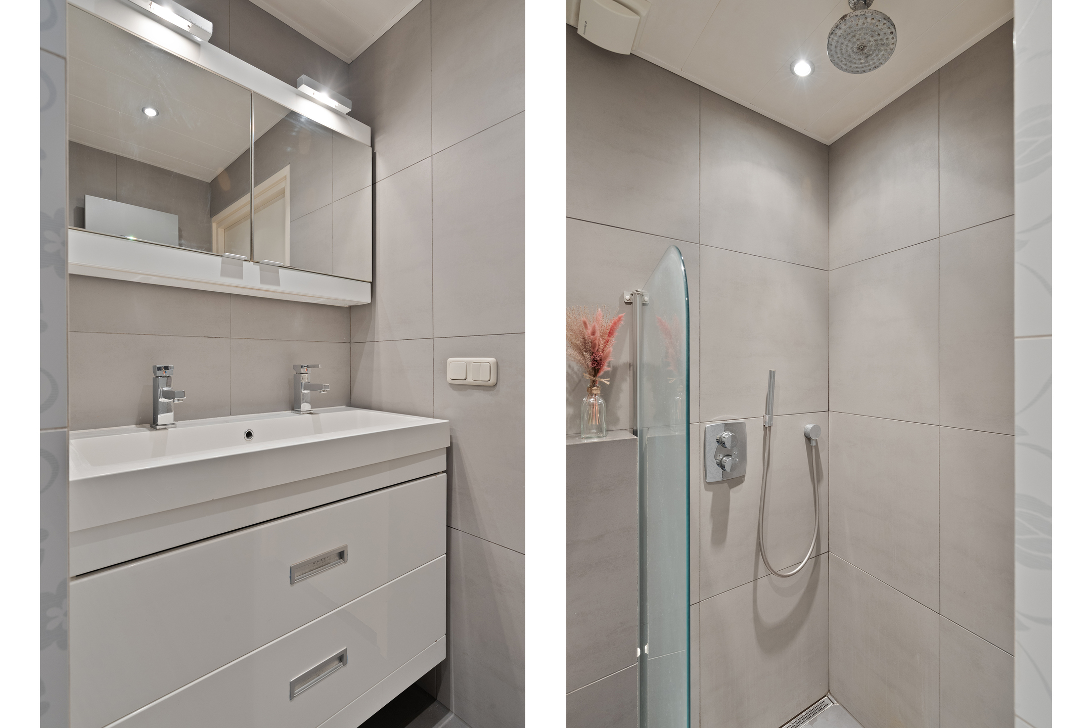 De luxe badkamer uit 2009 is van alle gemakken voorzien en strak afgewerkt. Je vindt hier een inloopdouche met rainshower, een dubbel wasmeubel, een designradiator, wandcloset en inbouwspots, wat samen een stijlvolle en comfortabele wellness-ervaring creëert.