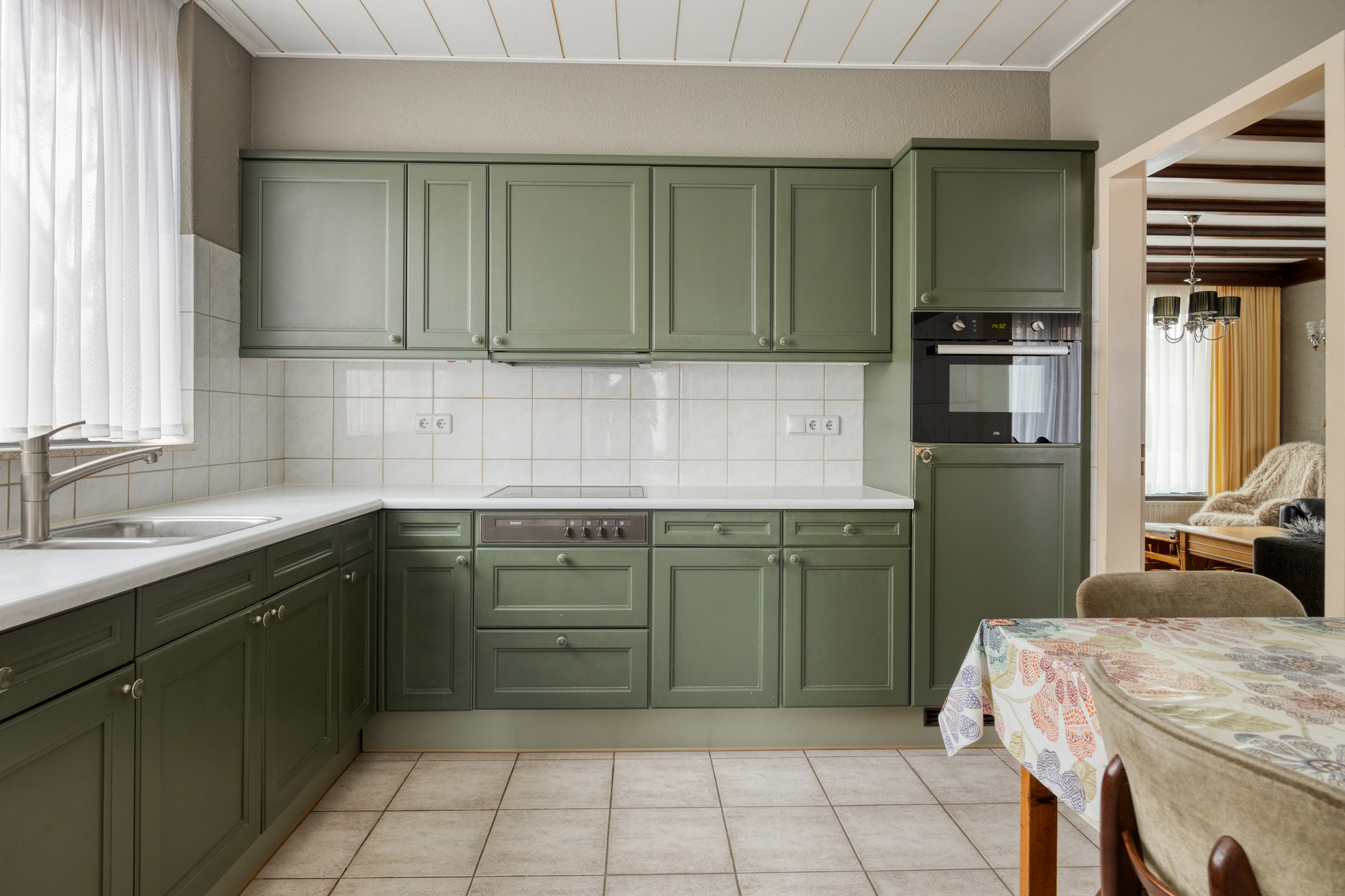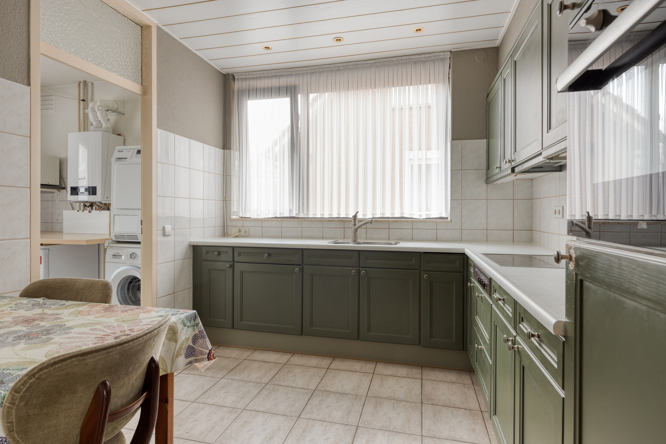 De aangrenzende keuken is ruim opgezet en biedt voldoende plaats voor het plaatsen van een eettafel, waardoor het een fijne plek is om te koken én samen te eten. De keuken is praktisch ingericht en afgewerkt met een tegelvloer, en beschikt over diverse inbouwapparatuur, waaronder een keramische kookplaat, combimagnetron en koelkast. Dankzij de opzet en ruimte is dit een comfortabele en functionele leefkeuken waar u dagelijks prettig gebruik van maakt.