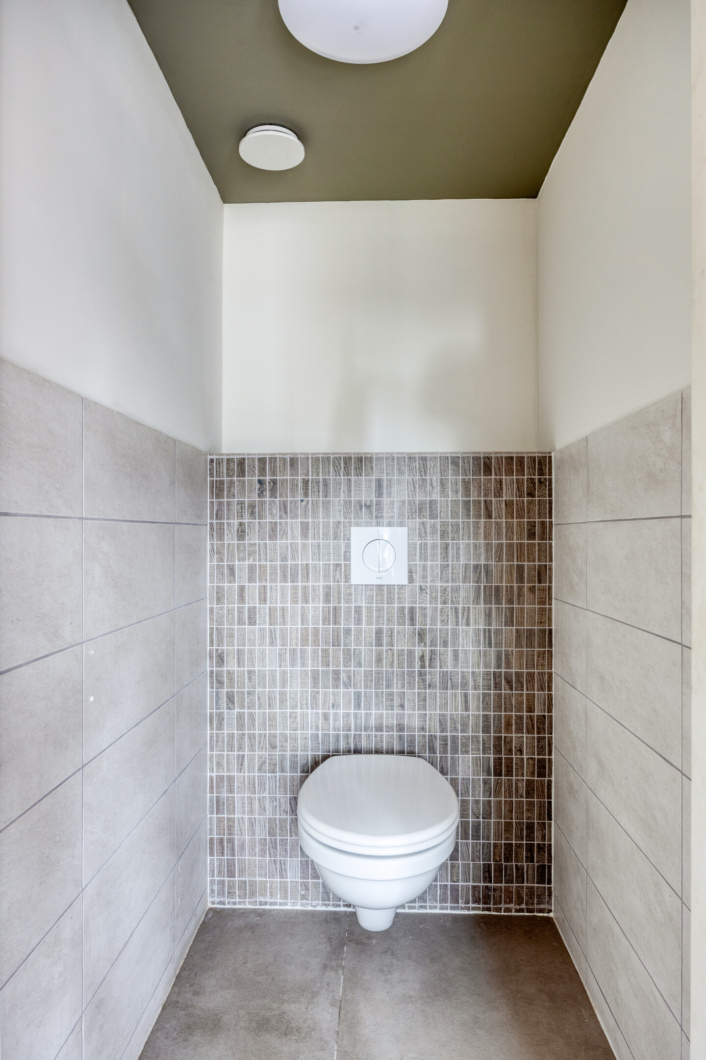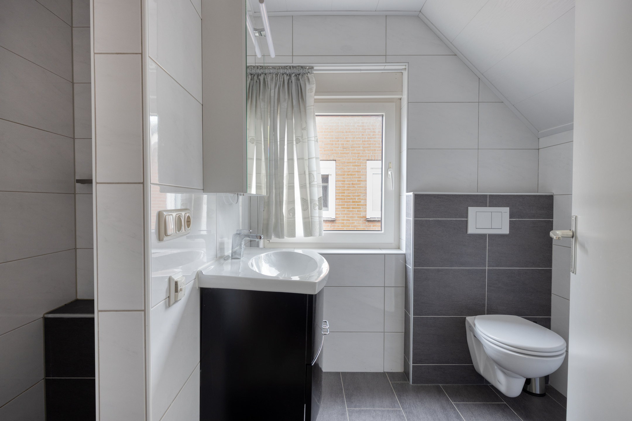De badkamer is volledig betegeld en voorzien van vloerverwarming, een inloopdouche, wastafel met meubel en een zwevend toilet.