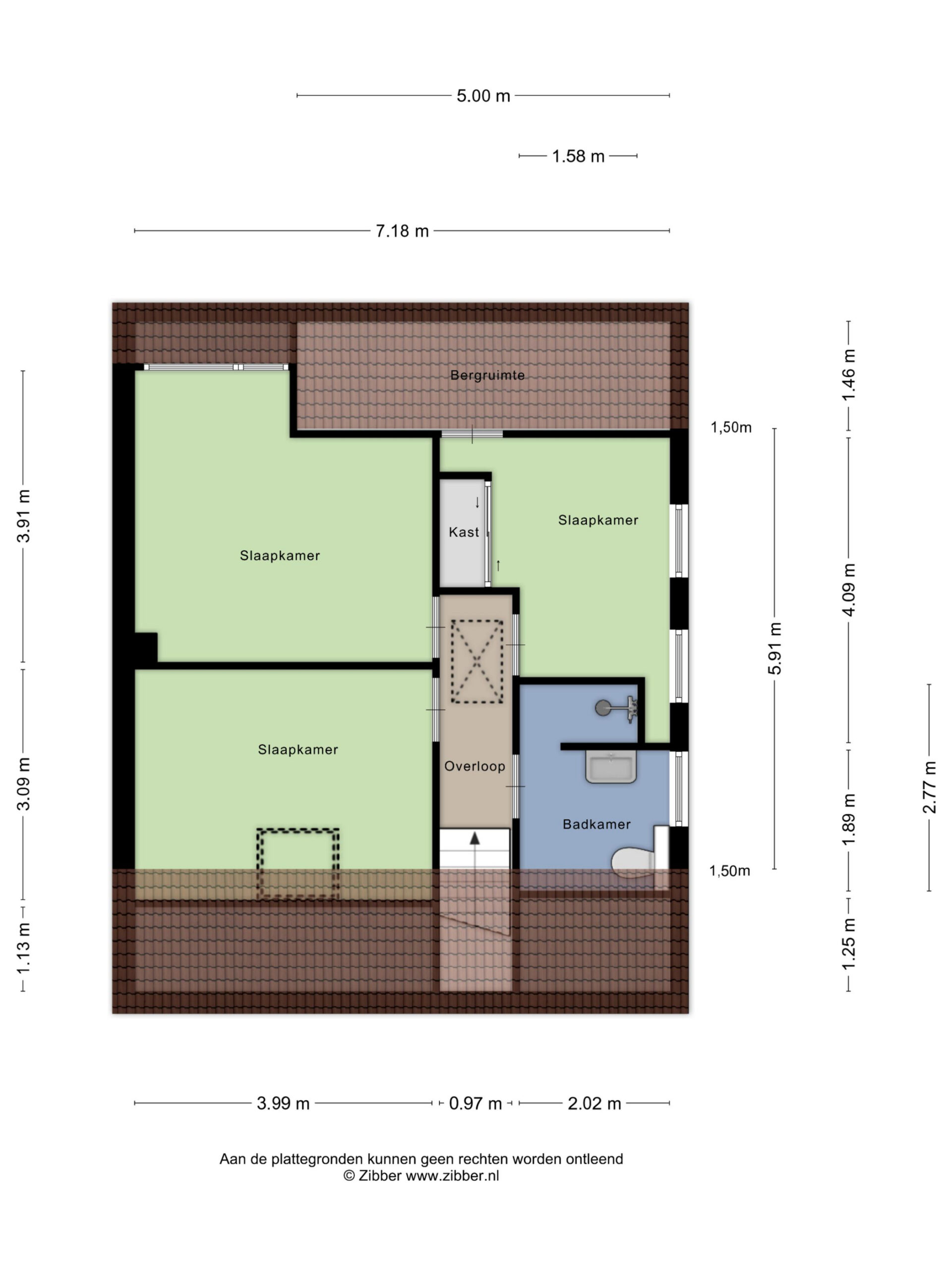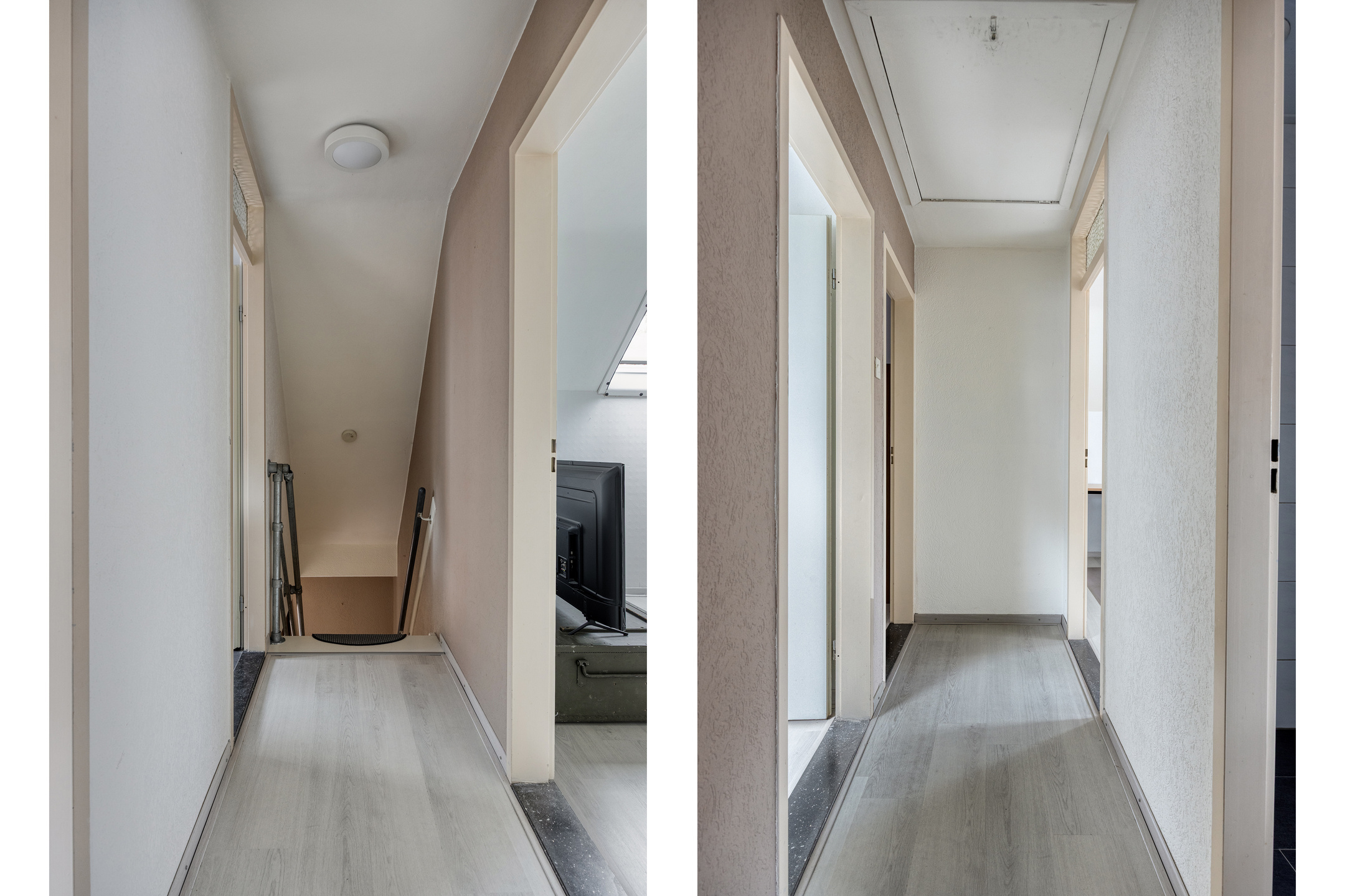De overloop biedt toegang tot drie slaapkamers, de badkamer en middels een vlizotrap tot de bergzolder.