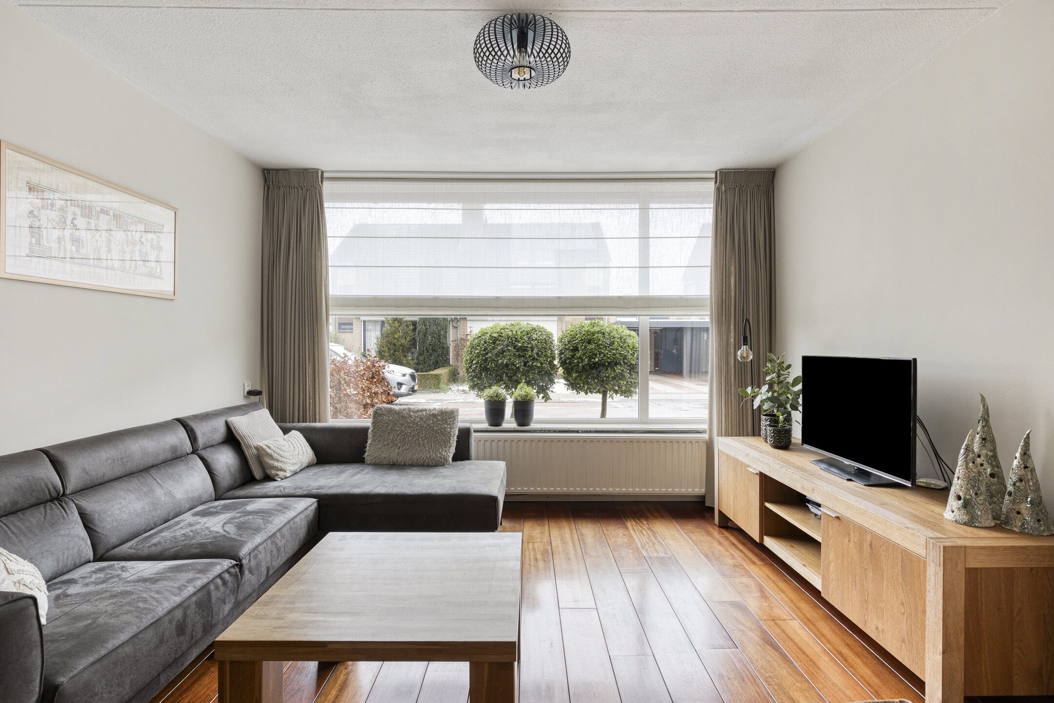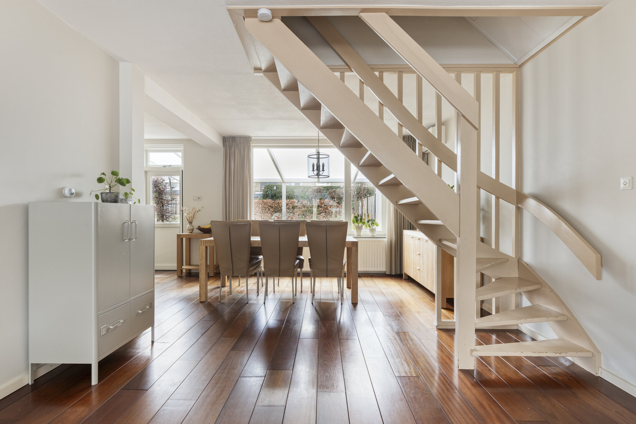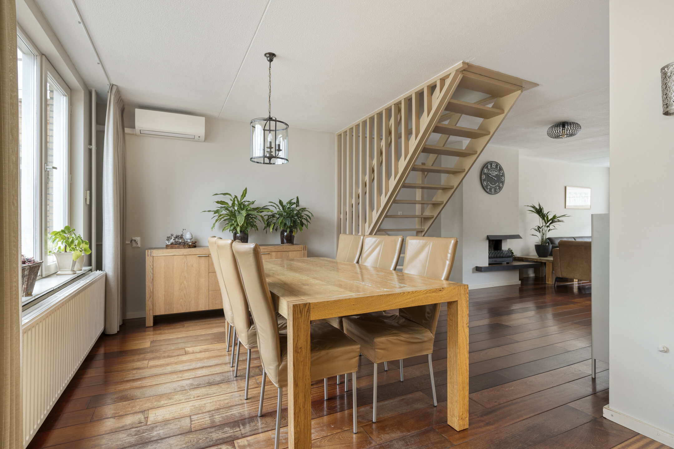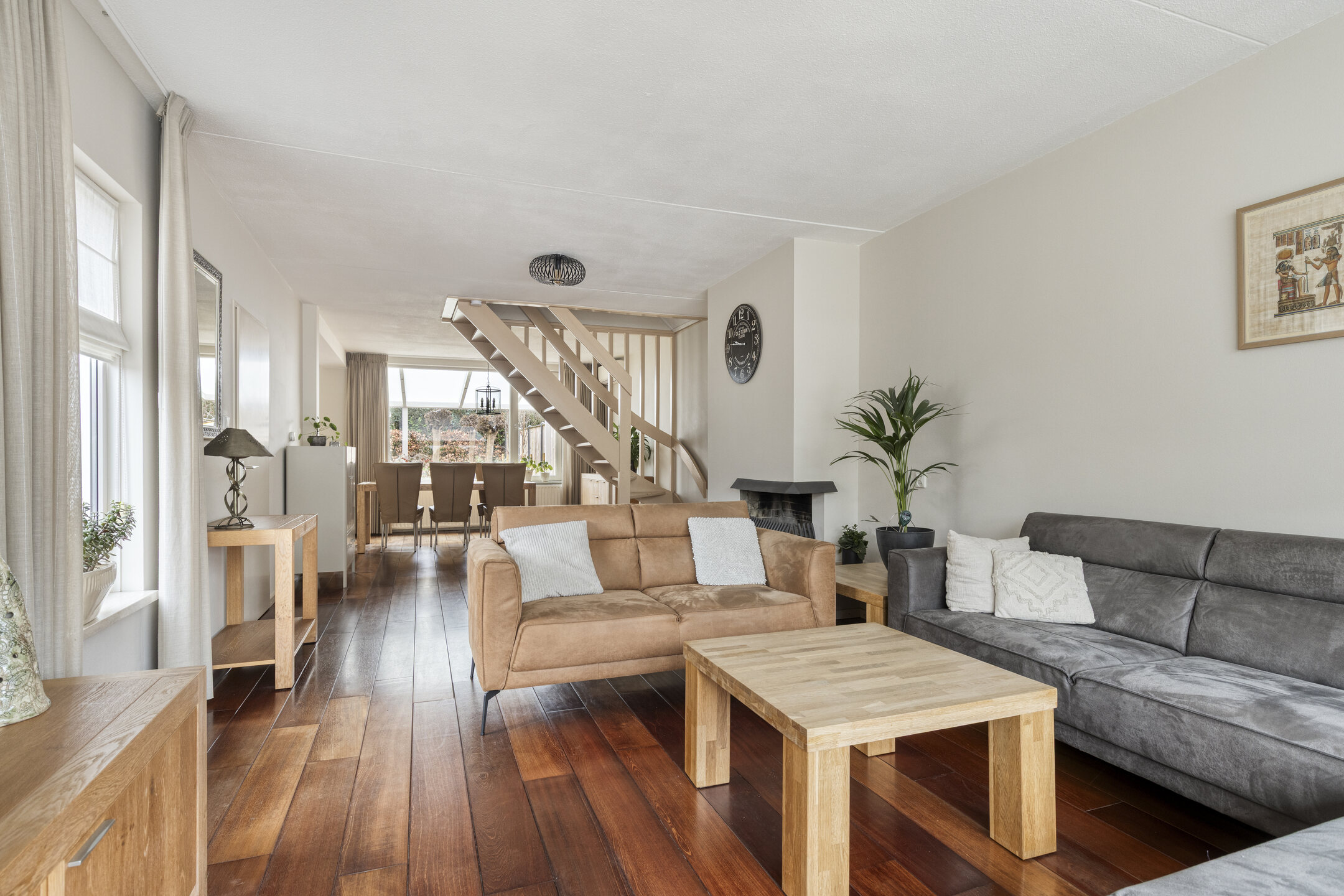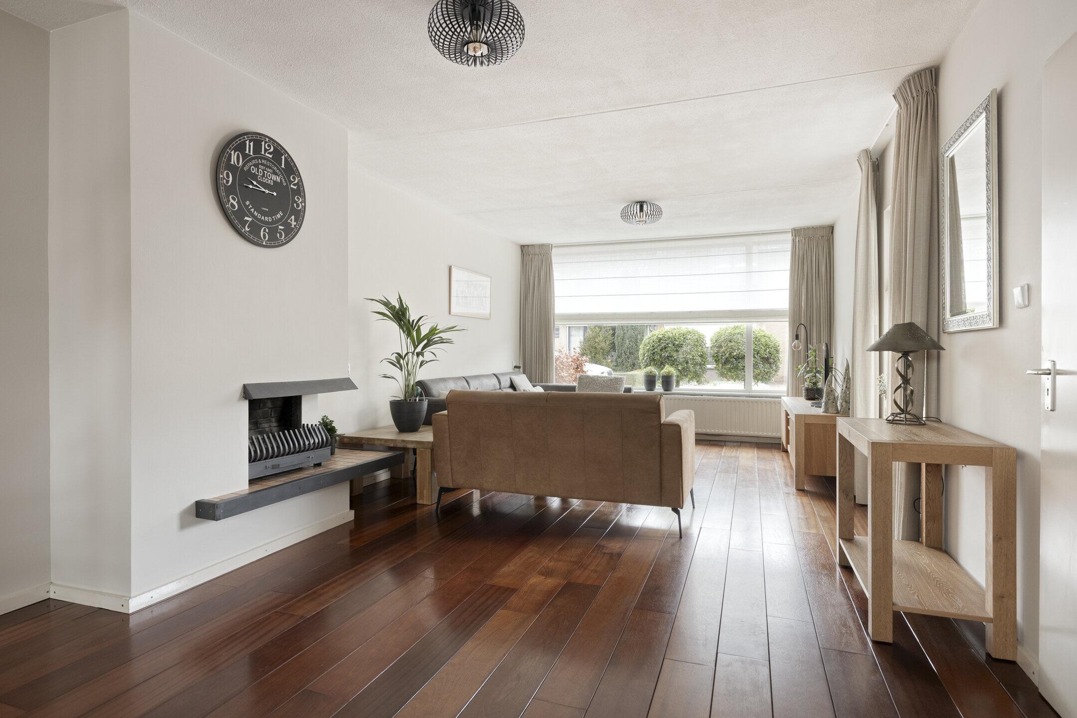 De lichte en ruime woonkamer beschikt over een open trap naar de eerste verdieping en is afgewerkt met een warme houten vloer. De ruimte is praktisch en sfeervol ingedeeld met een royale zit- en eethoek, waarbij de zithoek is voorzien van een gezellige open haard.