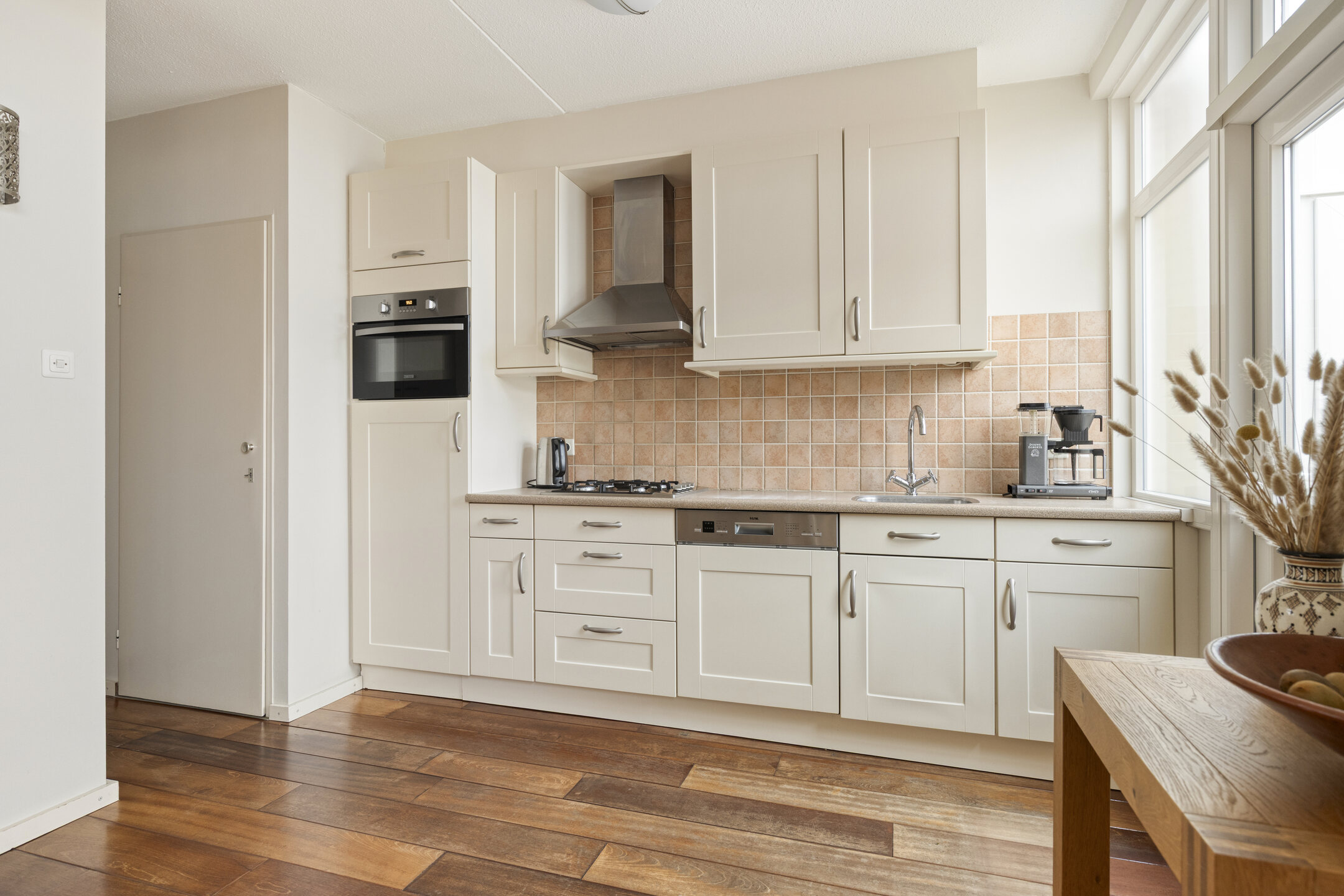 De open keuken is netjes ingericht en voorzien van een combimagnetron, vaatwasser, kookplaat en afzuigkap.