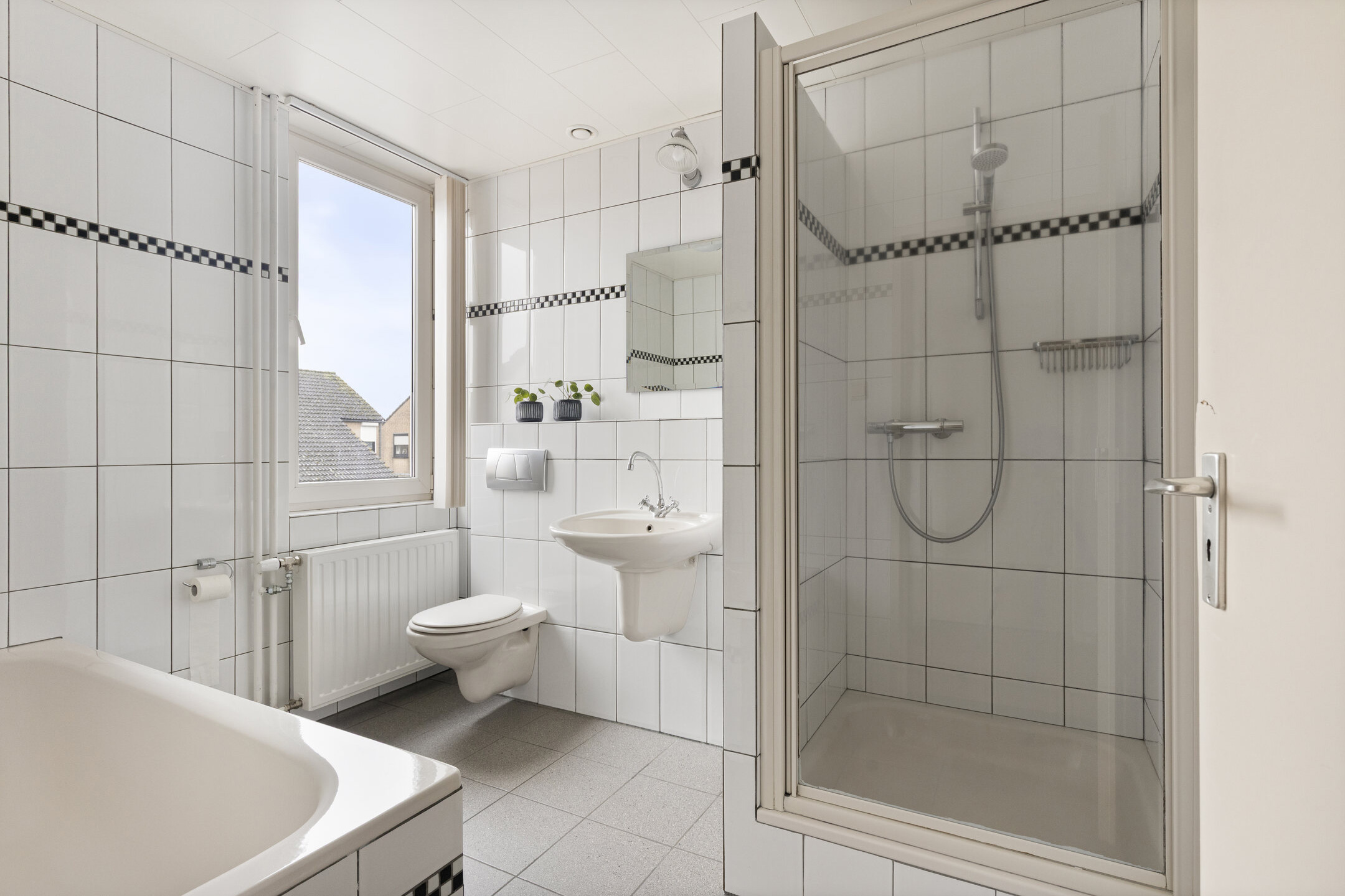 De badkamer is geheel betegeld en voorzien van een douche, ligbad, toilet en wastafel.
