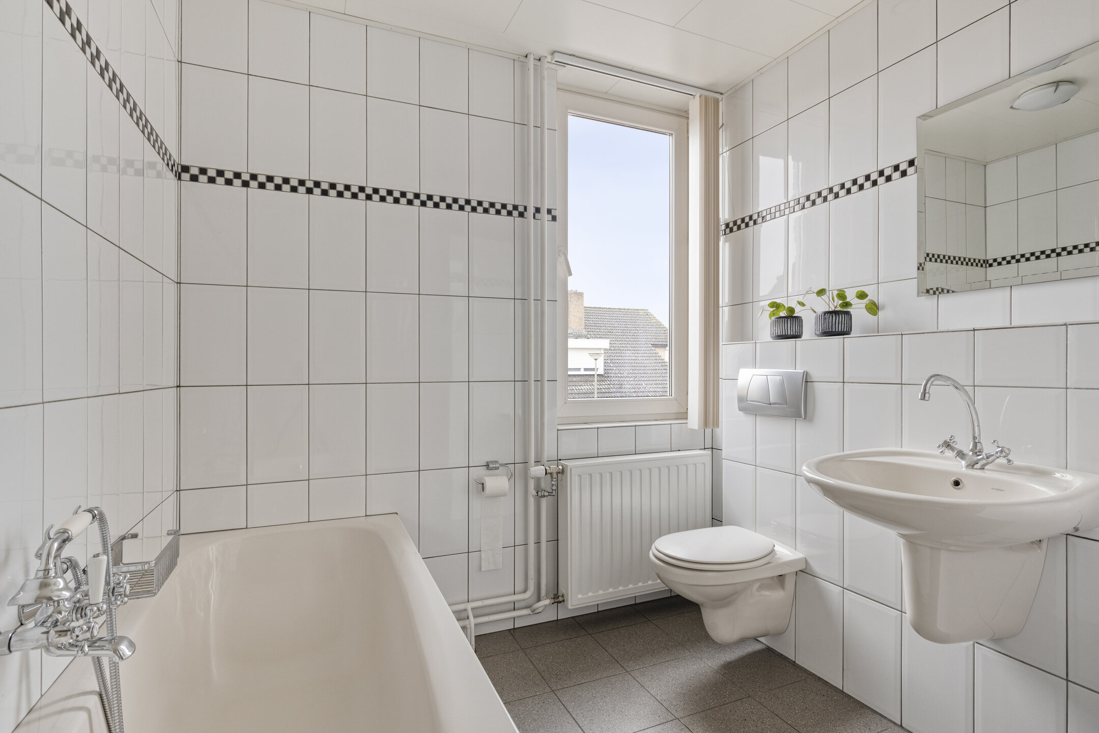 Het toilet is geheel betegeld en voorzien van een hangcloset en fonteintje.