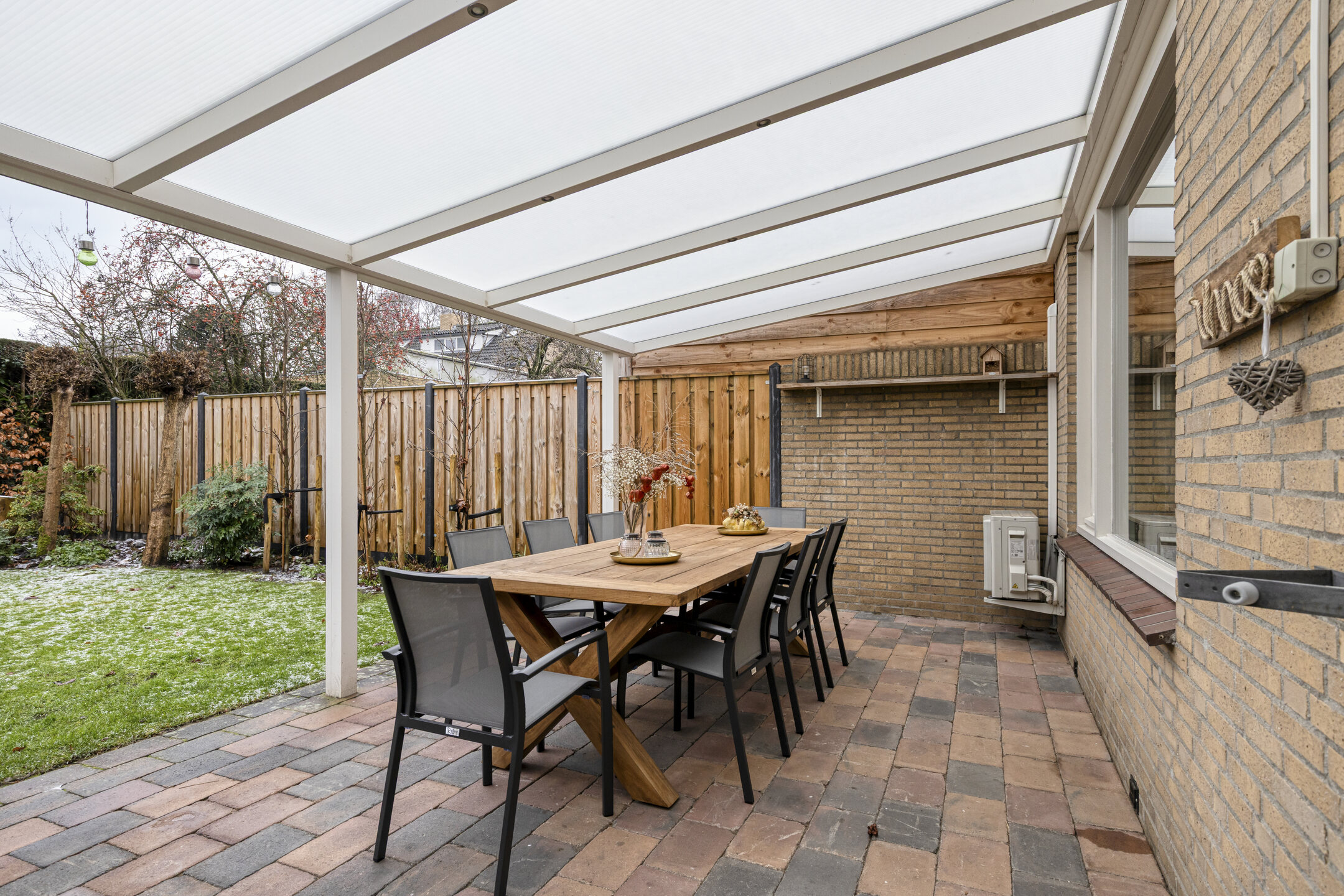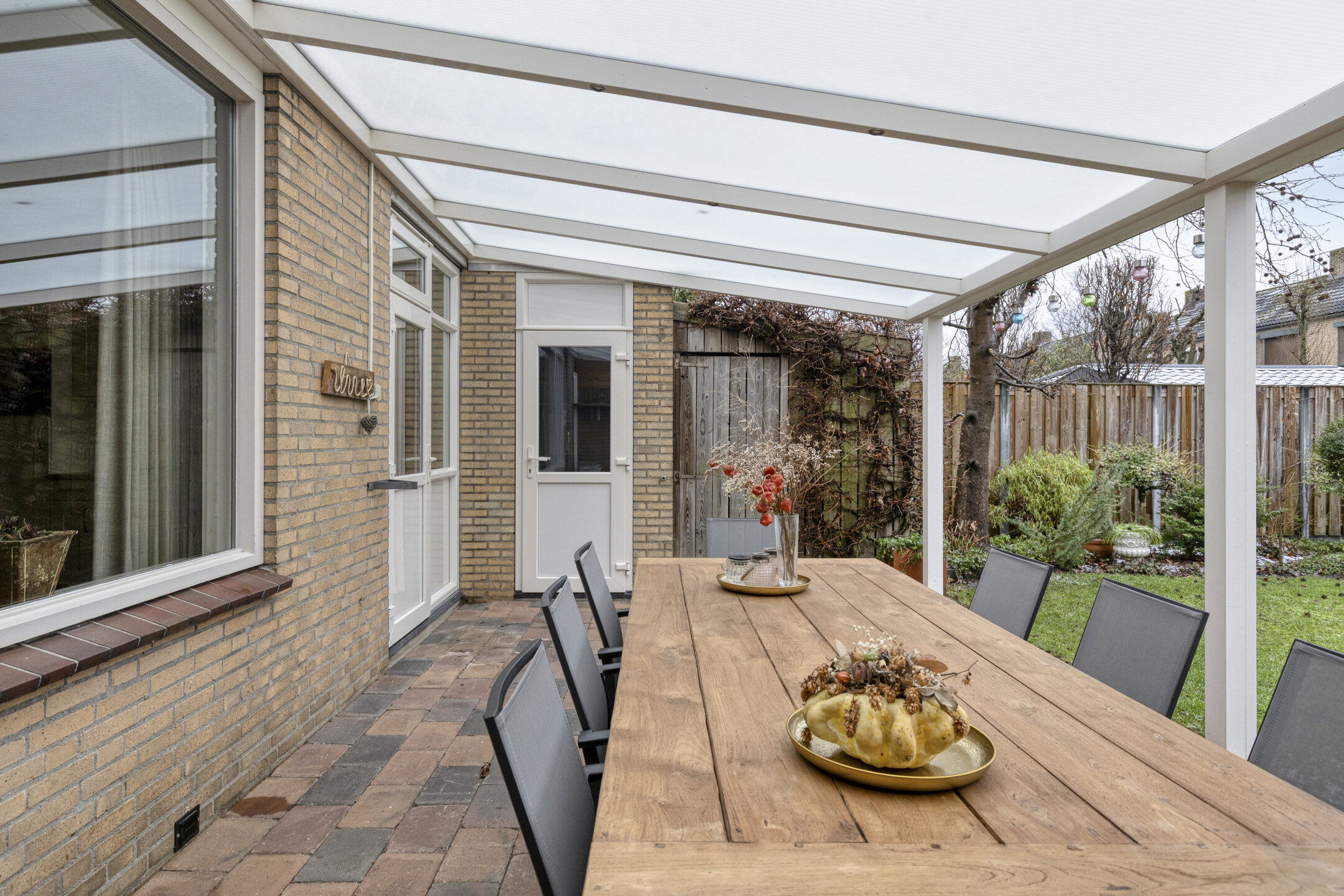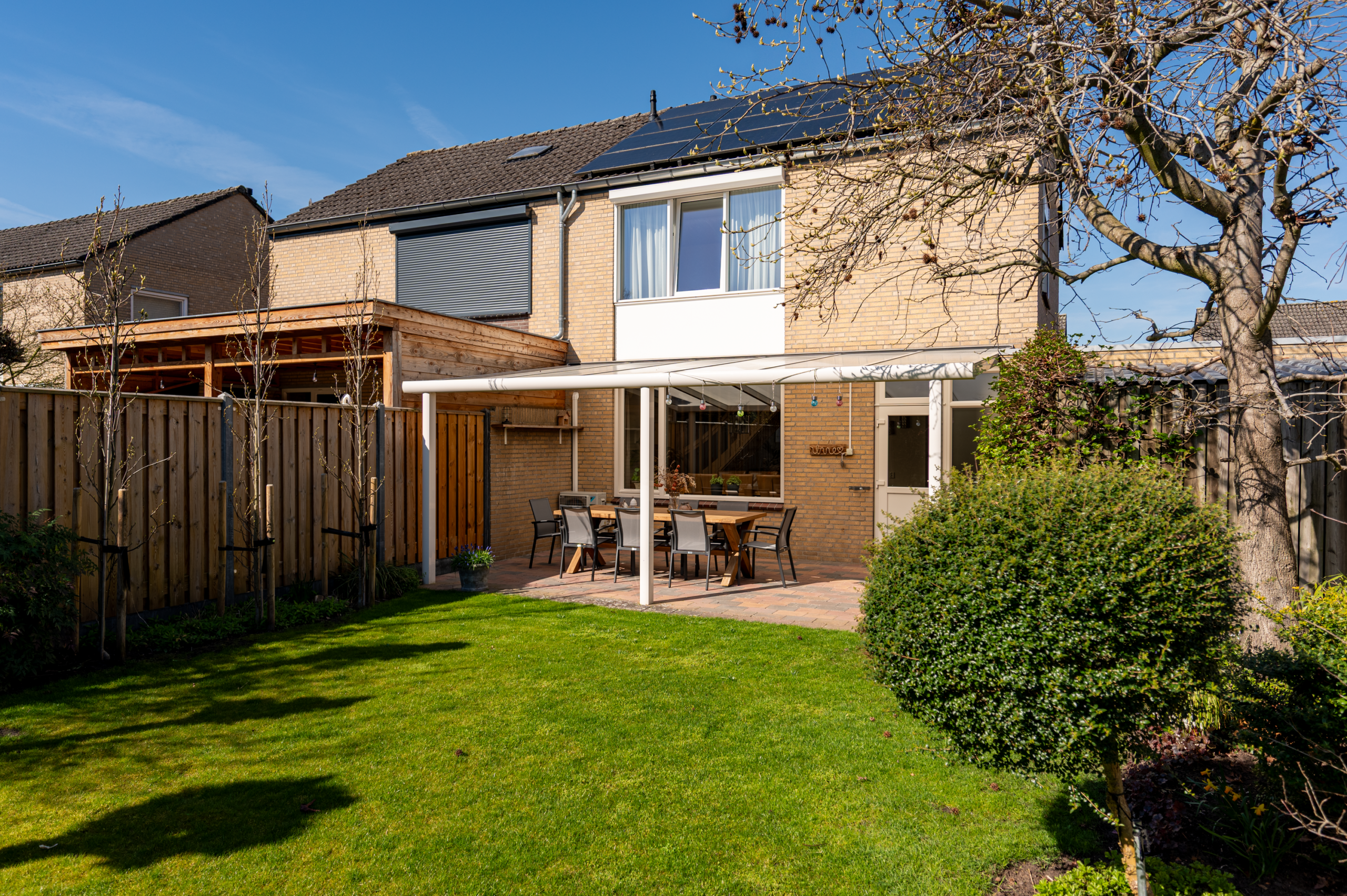 De tuin gelegen op het zuiden en is volledig omheind en beschikt over een groot terras met overkapping, waardoor u altijd een plek in de zon of schaduw vindt. Er is tevens een houten berging aanwezig, ideaal voor bijvoorbeeld het opslaan van uw tuinspullen. Vanuit de tuin is er toegang tot de garage.