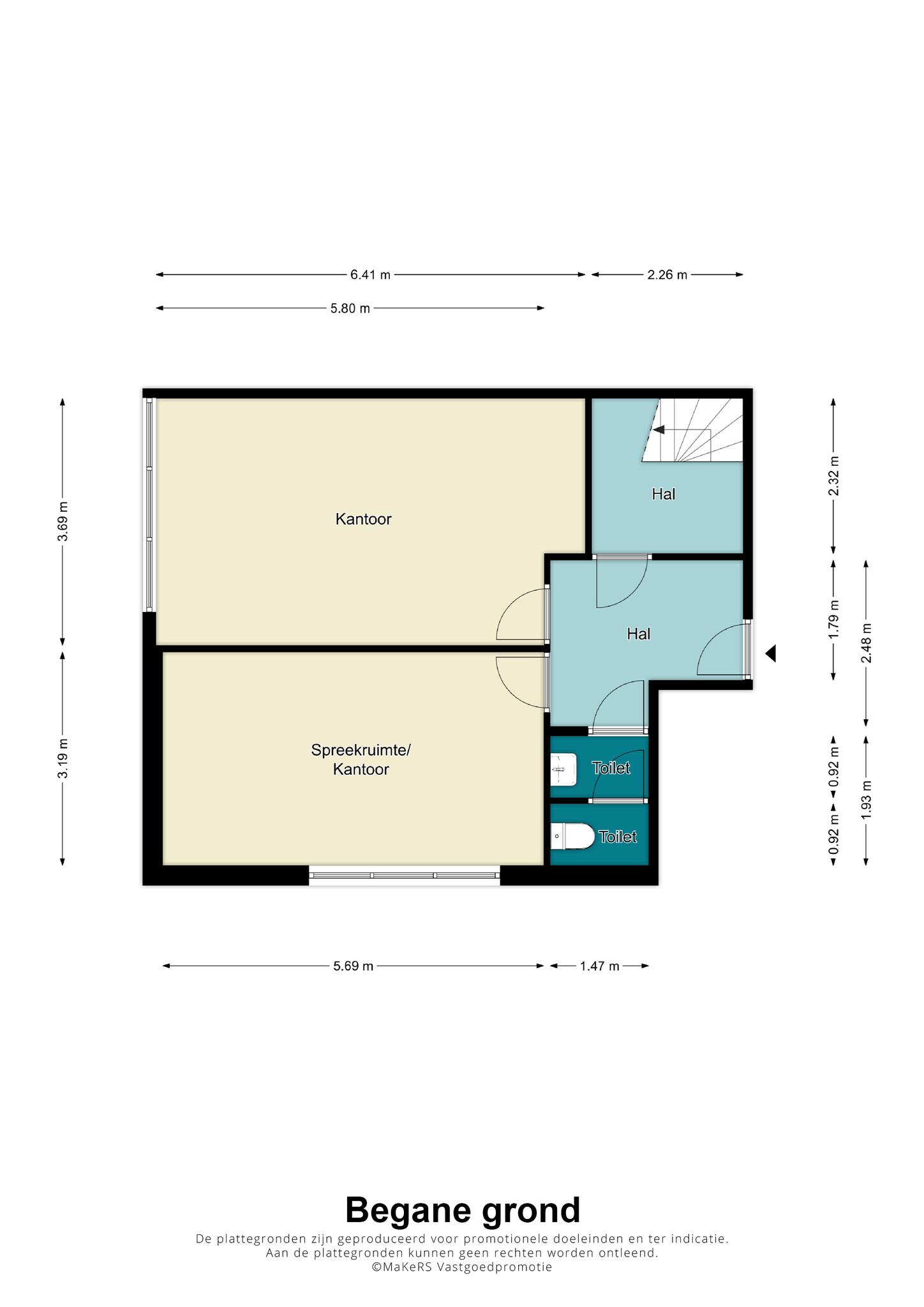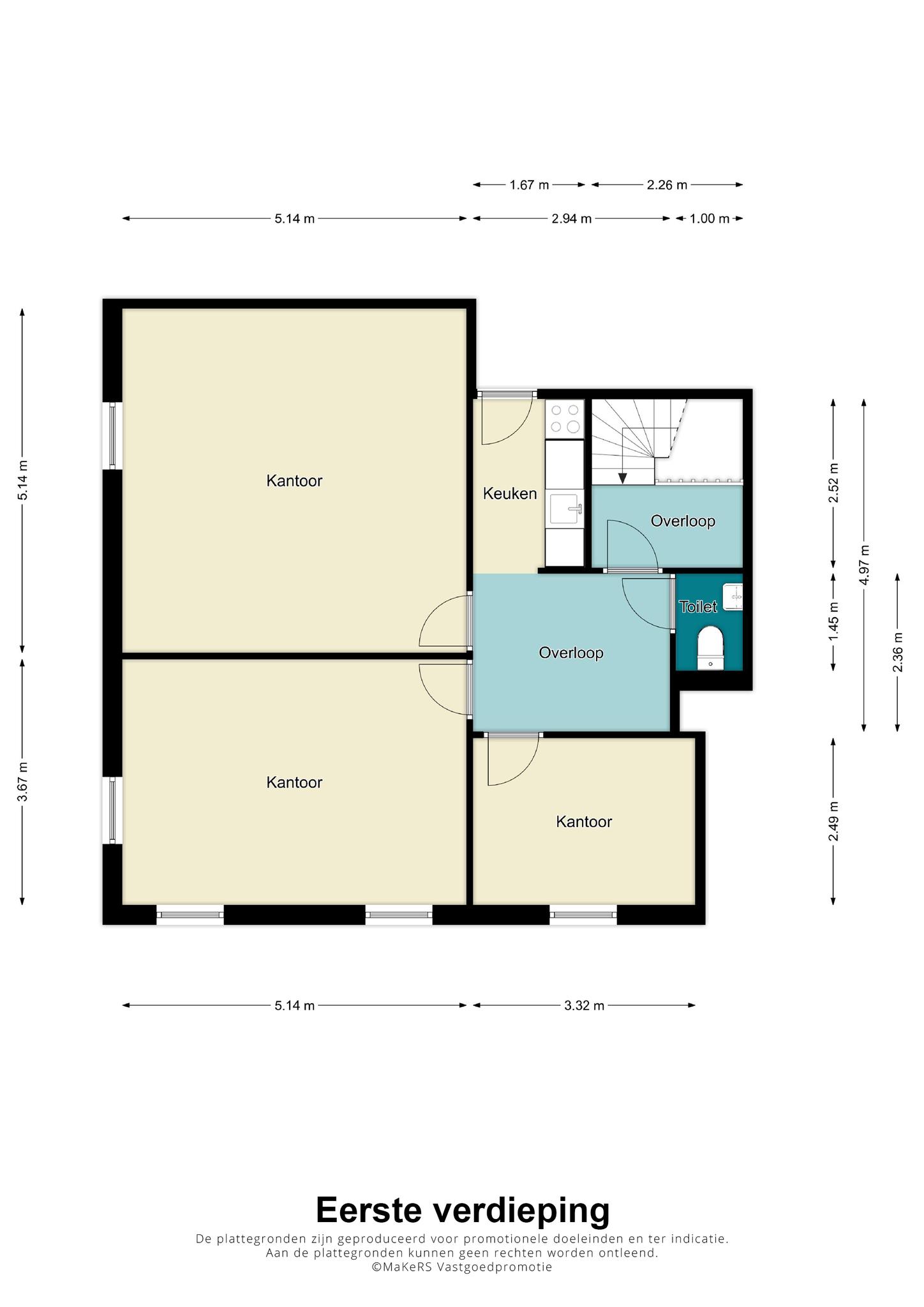 De kantoorruimtes zijn resp. 8, 18, 19, 23, 26 m2 groot.